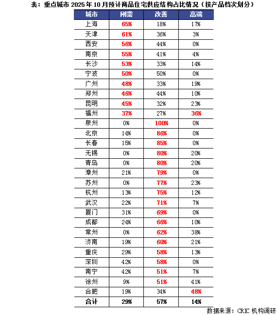 而从供应结构各产品档次分布来看,市场持续向改善需求倾斜:重点城市刚需、改善、高端占比结构为29%、57%和14%,呈现出以改善为主,刚需为辅的供应结构。