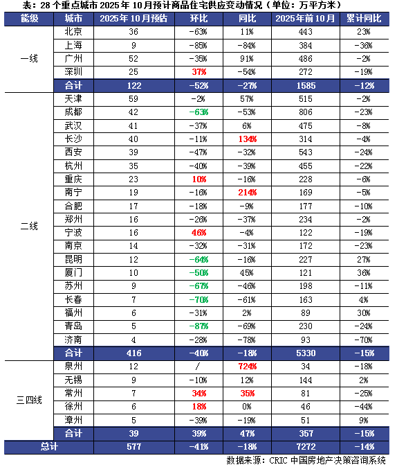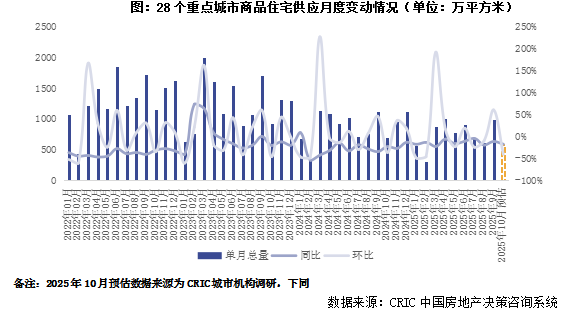 10月房企推盘积极性稳步回落,供给约束依旧显著:据CRIC调研,10月28城预计新增商品住宅供应面积577万平方米,环比下降41%,同比下跌18%,2025年前10月累计同比下降14%。