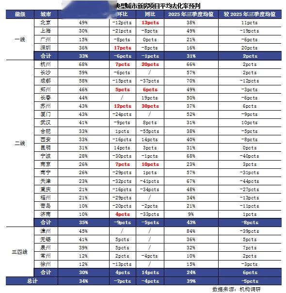 而从市场热度来看,或将高位回落:据CRIC监测数据,28个重点城市2025年10月预期项目平均去化率34%,环比下降7pcts,同比下降4cts。